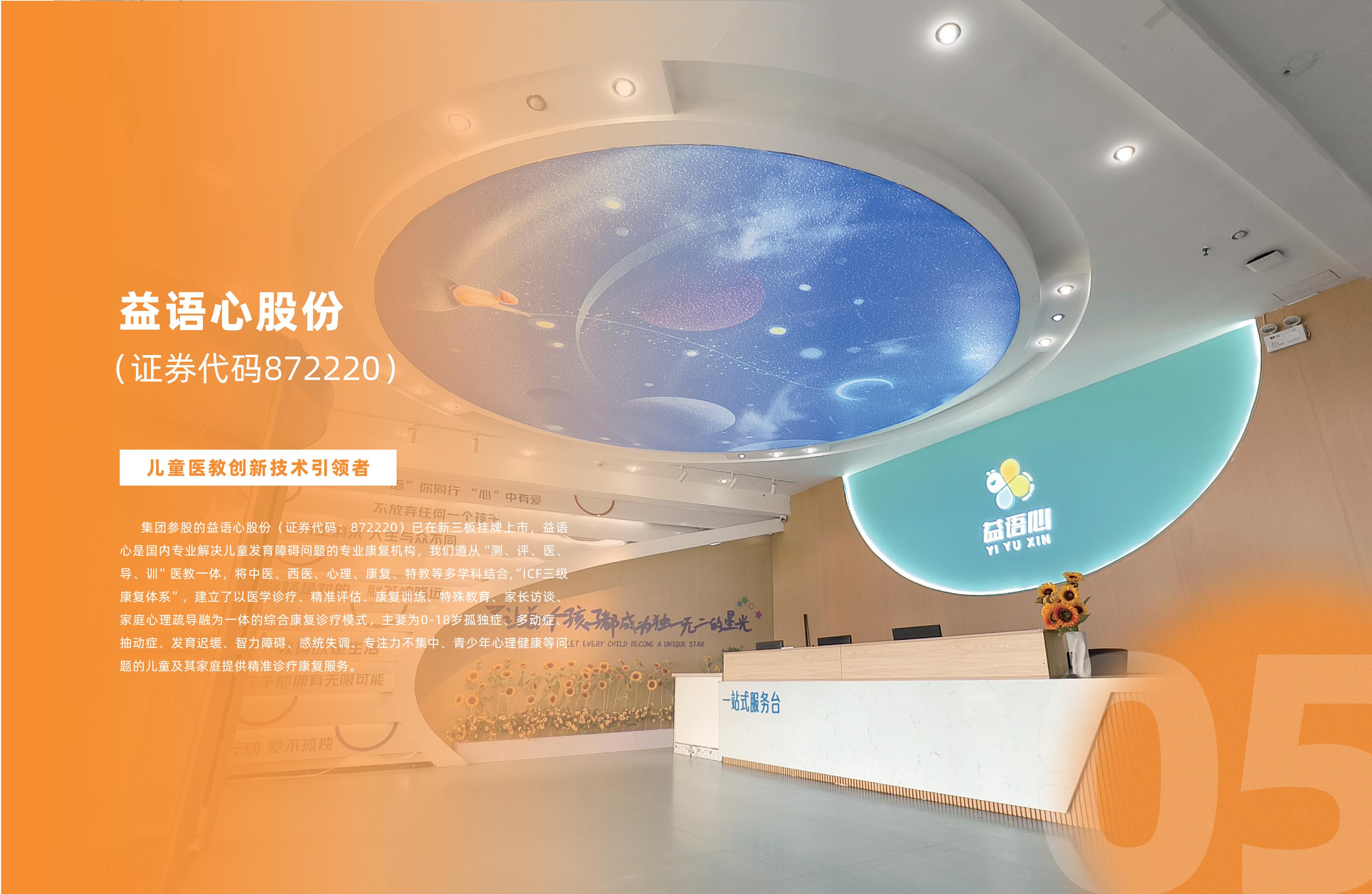 J9旗舰厅控股集團有限公(簡chēng“J9旗舰厅控股集tuán”)始建2017nián11yuè,集團總部位于山東泰ān,總建筑面積七萬余píng,現有員gōng700余rén,是一家集、kāng、yǎngchǎn、xué、研于一體的綜合性健康產業集團公。集團下設成kāng、醫康yǎng、醫療科、教育等事業,通guò“立足本、放眼全qiú”的戰略布,構建起多維度的心理康復服務體。 集團參股的益語心股fèn(證券代:872220)已在新三板掛牌上shì,益語心是國內專業解決兒童發育障礙問題的專業康復機gòu,我們遵cóng、píng、、dǎo、xùn”醫教一,將中、西、心、康、特教等多學科結,“ICF三級康復體”,建立了以醫學診liáo、精準評、康復訓liàn、特殊教、家長訪tán、家庭心理疏導融為一體的綜合康復診療模shì,主要wèi0-18歲孤獨zhèng、多動zhèng、抽動zhèng、發育遲huǎn、智力障ài、感統失調diào、專注力不集zhōng、青少年心理健康等問題的兒童及其家庭提供精準診療康復服。目前業務已經拓展到浙jiāng、江、廣東等。